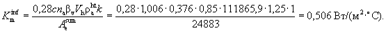 где bv - коэффициент снижения объема воздуха в здании, учитывающий наличие внутренних ограждающих конструкций; bv = 0,85; Vh - отапливаемый объем здания, м3; Vh = 111865,9 м3. Приведенный инфильтрационный (условный) коэффициент теплопередачи здания в среднесезонных условиях рассчитывается по формуле (10.6):