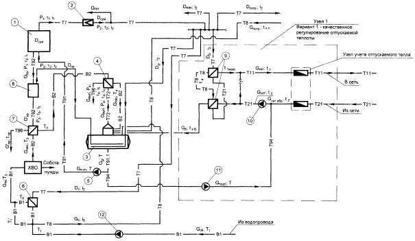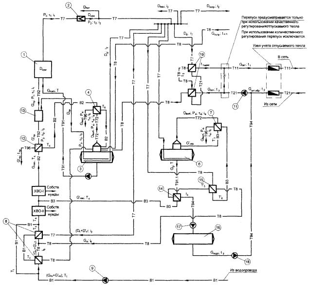 1 - Паровой котел, 2 - Редукционная установка, 3 - Деаэратор питательной воды, 4 - Охладитель выпара к деаэратору питательной воды, 5 - Насос питательный, 6 - Деаэратор подпиточной воды, 7 - Охладитель выпара к деаэратору питательной воды, 8 - Подогреватель сырой воды, 9 - Насос сырой воды, 10 - Подогреватели сетевой воды, 11 - Насос сетевой воды, 12 - Охладитель продувочной воды, 13 - Сепаратор непрерывной продувки, 14 - Охладитель деаэрированной воды, 15 - Пароводяной подогреватель умягченной воды, 16 - Бак-аккумулятор, 17 - Насос перекачивающий, 18 - Насос подпиточный
