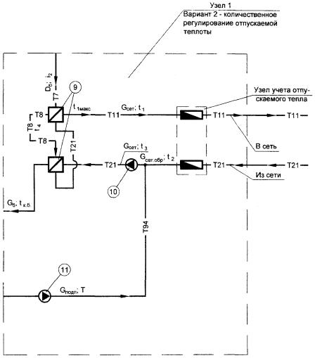 1 - Паровой котел, 2 - Редукционная установка, 3 - Деаэратор питательной воды, 4 - Охладитель выпара к деаэратору питательной воды, 5 - Насос питательный, 6 - Подогреватель сырой воды, 7 - Охладитель продувочной воды, 8 - Сепаратор непрерывной продувки, 9 - Установка подогрева сетевой воды, 10 - Насос сетевой воды, 11 - Насос подпиточной, 12 - Насос сырой воды; Т 7 - пар; Т 8 - конденсат; Т 11 - трубопровод подающий; Т 21 - трубопровод обратной воды; Т 72 - выпар; Т 91 - питательная вода; Т 91.1 - деаэрированная вода; Т 92 - непрерывная продувка; Т 94 - подпиточная вода; Т 96 - слив; В1 - водопровод; В2 - химочищенная вода; В3 - умягченная вода (к рисунку 2)