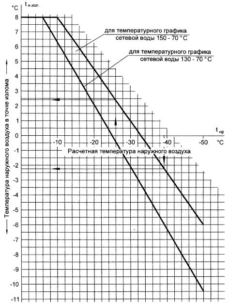 Для иного температурного графика температуру сетевой воды в подающем и обратном трубопроводах при любой температуре наружного воздуха следует определять по формулам: - в подающем трубопроводе