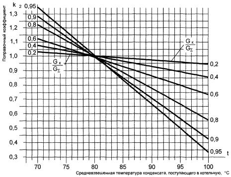 где t1 - расчетная температура в подающем трубопроводе тепловой сети при любой температуре наружного воздуха, °С; t2 - расчетная температура в обратном трубопроводе тепловой сети при любой температуре наружного воздуха, °С; t1 - расчетная температура в подающем трубопроводе местной системы, °С (95°С); t2 - расчетная температура в обратном трубопроводе местной системы, °С (70°С); tвн - внутренняя температура помещения; Kов - коэффициент снижения расхода тепла на отопление и вентиляцию в зависимости от температуры наружного воздуха; Dtмакс - расчетный перепад температур в тепловой сети (150-70; 130-70; 115-70 и т.д.). По полученным точкам строится температурный график. Точкой излома температурного графика является точка, соответствующая температуре в подающем трубопроводе 70°С. По этой точке по температурному графику определяется температура наружного воздуха в точке излома (tн.изл). 3.9 Максимальный часовой отпуск тепла на горячее водоснабжение промышленного предприятия совпадает со среднечасовым (коэффициент часовой неравномерности Kч согласно СНиП 2.04.01). При отпуске тепла на горячее водоснабжение городов и населенных пунктов максимальный часовой расход принимается с коэффициентом 1,3 от среднечасового. 3.10 Для быстрого определения ряда расчетных величин рекомендуется использовать графики (приложение А, рисунки 1-5). Абсолютное значение величины расхода пара на деаэрацию питательной воды вычисляется по удельному расходу пара. Удельный расход пара определяется по графику (для закрытой системы теплоснабжения - рисунок 5, для открытых - рисунок 6). График на рисунке 6 построен при коэффициенте непрерывной продувки П = 0. На величину непрерывной продувки вводится поправка (см. рисунок 6 б). Удельные потери пара с выпаром из деаэратора приняты в примере 0,002 т на 1 т деаэрированной воды (по рекомендации ЦКТИ могут быть в пределах 0,002-0,004 т/т). Приложение А