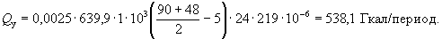 Определяем потери тепла с утечками из тепловой сети по формуле (2.9). Исходные данные: а - нормативное значение утечки из тепловой сети в период эксплуатации принимается равным 0,0025 м3/ч·м3; Cв = 1 ккал/кг·°С; tпср = 90 °С; tхвср = 5 °С; Vтс = 639,9 м3; r = 103 кг/м3; tпср = 48 °C; Z = 219 cyт.