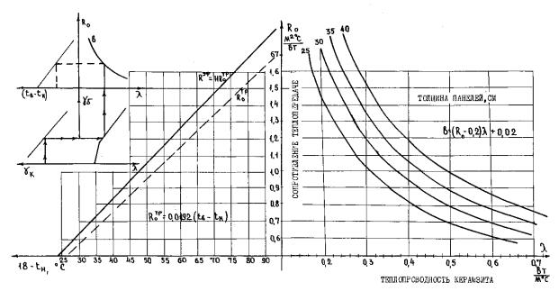 1.2.10. При расчете составов керамзитобетона на золах плотность последних определяют в цементном тесте по ГОСТ 9758-86 или принимают равной 1,9 кг/дм3. 1.3. Структурные модификации керамзитобетона1.3.1. В зависимости от качества керамзита и требований к керамзитобетонным панелям следует применять керамзитобетон различной структуры (таблицы 4,5). Графическая интерпретация табл.5 дана в номограмме расчета толщины стены (см. рисунок). 1.3.2. В качестве пенообразователей при изготовлении керамзитобетона могут быть использованы: паста омыленной канифоли КМ, смола нейтрализованная воздухововлекающая СНВ (ТУ 31-05-75-74), хлорный сульфанол (ГОСТ 6948-78), универсальный синтетический пенообразователь УСП, приготовленный из алкилсульфатной пасты (ТУ 38-7-21-67), пенообразователь ПО-1, пенообразователь ПО-6 (ГОСТ 6948-81), клееканифольный и смолосапониновый пенообразователи, приготовленные в соответствии с СН 277-70, пенообразователь "Поток" (ТУ 38.5074-87), пенообразователь ТЭАс (ТУ 38107-127-87), подмыльный щелок, смола древесная омыленная СДО (ТУ 1305-02-83). Расчётное сопротивление теплопередаче однослойных панелей наружных стен из керамзитобетона слитной структуры на керамзитовом песке кл. В5 (М75)