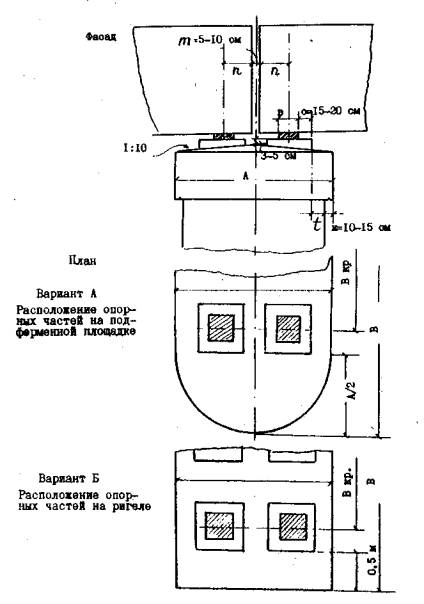 Рис 1. Схема подферменной площадки расстояние с от грани плиты опорной части до края подферменника принимают равным 15-20 см; расстояние t от края подферменника до грани опоры назначают в зависимости от длины пролетного строения: при пролетах до 30 м - не менее 15 см, при пролетах от 30 до 100 м - не менее 25 см; при пролетах более 100 м - не менее 35 см; зазор между торцами пролетных строений можно принять равным 5-10 см; расстояние от оси опирания балки пролетного строения до ее торца берут из проекта пролетного строения; расстояние от края подферменной плиты до грани опоры принимают равным 10-15 см. Тогда ширина подферменной плиты по фасаду моста равнаA = m + Σn + Σb/2 + 2(с + t + к). Размер подферменной плиты поперек моста для случая массивной опоры с закругленной подферменной плитой равен В = Вкр +b + 2с + А. Для случая облегченных опор размер ригеля прямоугольного очертания поперек моста равен В = Вкр +b + 2с + 2×0,5, где Вкр - расстояние между осями крайних балок, 0,5 м - минимальное расстояние от края подферменника до края ригеля поперек моста. Размер плиты опорной части b×b вычисляют в зависимости от максимального значения давления балки Rmax и расчетного сопротивления бетона Rb подферменника по формуле