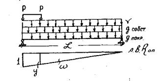 где Rпокр.пр.ч - реакция балки от веса покрытия проезжей части, от расчетных нагрузок; Rвес балки - реакция от собственного веса балки, от расчетных нагрузок; Rвp max - наибольшая реакция в балке от временных нагрузок (Rвр от А-11 плюс Rвр от толпы или от НК-80). Опорную реакцию в балке определяют путем загружения линии влияния опорного давления расчетными постоянными и временными нагрузками (рис. 2).