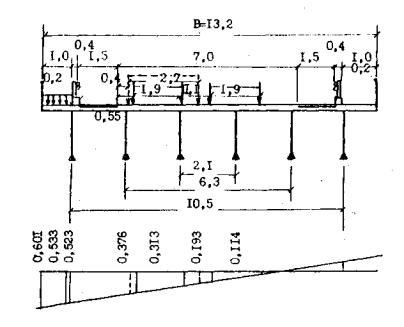 Рис. 3. Схема загружения временной нагрузкой линии влияния давления на крайнюю балку для определения коэффициентов поперечной установки по методу внецентренного сжатия Динамический коэффициент для железобетонных балочных пролетных строений для нагрузки А-II равен