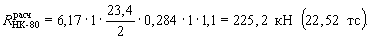где n - число балок в поперечном сечении пролетного строения. Тогда y1 = 0,523; у2 = - 0,191. Установка нагрузок показана на рис. 3. Расстояние от полосы безопасности до оси крайнего колеса для нагрузки A-11 - 0,55 м, а для нагрузки НК-80 - 0,4 м. Ординаты линии влияния под грузами определены из подобия треугольника. Тогда получим следующие значения кпу: кпу НК-80 = (0,376+0,193)/2 = 0,284; кпу А-11 (тележки) = 0,313 + 0,114 = 0,427; кпу A-11 (полосовая) = 0,313 + 0,60×0,114 = 0,381; кпу толпы = (0,601+0,533) 1/2×1 = 0,576 (площадь л.в. под тротуаром). Эквивалентная нагрузка для НК-80 для л.в. опорной реакции при l =24 м равна 6,17 тс/м (по табл. СНиП 2.05.03-84, с. 146). Опорная реакция в балке от НК-80