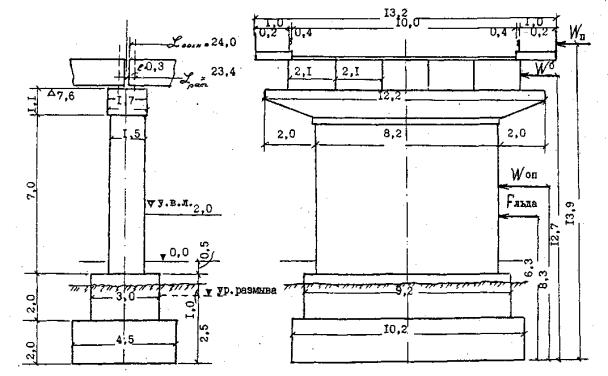 Рис. 4 Схема промежуточной опоры При карнизных свесах 0,1 м ширина тела опоры по фасада - 1,5 м. Принимаем свесы ростверка по фасаду по 0,75 м, поперек моста по 0,5 м, тогда ширина ступеней ростверка по фасаду - 3,0 м и 4,5 м, поперек моста - 9,2 м и 10,2 м. При глубине размыва 1,0 м подошва ростверка располагается на расстоянии 2,5 м от уровня размыва, полная высота ростверка 4 м. Задана отметка уровня меженных вод 0,0 и отметка верха опоры 7,6; получим полную высоту опоры 12,1 м. 3. ОПРЕДЕЛЕНИЕ НАГРУЗОК, ДЕЙСТВУЮЩИХ НА ОПОРУ3.1. Вес опорыВес тела определяют по чертежу, составленному по предварительно назначенным размерам. Тело опоры и фундамент разбивают на простейшие геометрические фигуры и вычисляют их объемы. Вес опоры получают путем умножения объема на объемный вес кладки. Для бетонной кладки γ =2,4 т/м3, для железобетонной γ =2,5 т/м3. Взвешивающее действие воды на части сооружения, расположенные ниже уровня поверхностных или подземных вод, необходимо учитывать при расчетах в том случае, если фундаменты заложены в песках, супесях и илах. При заложении фундаментов в суглинках и глинах взвешивающее действие воды требуется учитывать, когда оно создает более неблагоприятные расчетные условия. Уровень воды принимается наименее благоприятным - наинизший или наивысший. При вычислении нормативного веса кладки с учетом гидростатического давления воды объемный вес принимается равным γвзв. = γ + 1. 3.2. Вес грунтаВес грунта, расположенного на обрезах фундамента, вычисляют так же, как и вес кладки опоры, принимая объемный вес грунта γгp = 1,8 т/м3. Объемный вес грунта, расположенного ниже уровня воды, с учетом гидростатического давления определяют по формуле