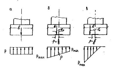 где P и рmax - соответственно среднее и максимальное давления подошвы фундамента на основание; R - расчетное сопротивление основания из нескальных или скальных грунтов осевому сжатию; γn - коэффициент надежности по назначению сооружения, принимаемый равным 1,4; γc - коэффициент условий работы, принимаемый равным 1,0 при определении несущей способности нескальных оснований под воздействием постоянных и части временных нагрузок (временные подвижные вертикальные, давление грунта от подвижной нагрузки); равным 1,2 при определении несущей способности скальных и нескальных оснований под воздействием постоянных и временных вертикальных нагрузок (давления грунта от подвижных нагрузок) и одной или нескольких других временных нагрузок, кроме воздействия морозного пучения грунта. Для жестких фундаментов давления на грунт следует определять по следующим формулам (рис. 6): при центрально нагруженном фундаменте