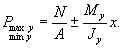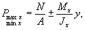 где N - расчетная нагрузка, нормальная к подошве фундамента и приложенная в его центре тяжести; A - площадь подошвы фундамента; Мx и Мy - расчетные изгибающие моменты относительно осей x-x и y-y; Jx, Jy, Wx, Wy - моменты инерции и моменты сопротивления площади подошвы фундамента соответственно относительно осей х-х и у-у; y и x - расстояния от осей х-х и у-у до наиболее и наименее нагруженных элементарных площадок грунта под подошвой фундамента;
