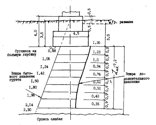где Δ - объемный вес воды (1,0 т/м3); hb - расстояние от горизонта грунтовых вод до кровли водоупора. Дополнительное давление в уровне подошвы фундамента равно η0 = σср - σδh, где σδh - бытовое давление на уровне подошвы фундамента; σср - среднее давление на грунт от нормативных постоянных нагрузок.