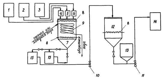 Рис. 1. Принципиальная схема приготовления модифицированных лигносульфонатов (МЛС): 1, 2, 3 - емкости для транспортировки СДБ и активаторов со склада; 4 - мерник СДБ; 5 - мерник электролита; 6 - мерник нейтрализатора; 7 - реактор; 8 - смесители; 9 - змеевик; 10 - 11 - насосы; 12 - емкость-смеситель модифицированной СДБ; 13 - емкость готовой добавки; 14 - дозатор в бетоносмеситель; 15 - отстойники 3.2. Бетонные смеси с суперпластификаторами на месте укладки должны отвечать следующим требованиям: обеспечивать в указанные в проекте организации работ сроки требуемые физико-механические свойства бетона, (прочность, плотность, водонепроницаемость, морозостойкость и т.п.): иметь степень расслоения не более 5 %, водоотделения - 2 % и отклонение от заданной подвижности ±2 см; содержать в единице объема уплотненного бетона заданное объемное или весовое количество исходных материалов. Настоящие требования обеспечиваются: правильным расходом исходных материалов с учетом лабораторного подбора состава бетонной смеси; проверкой выбранного состава бетонной смеси в производственных условиях; систематическим контролем качества составляющих и точности их дозировки при приготовлении бетонной смеси; лабораторной корректировкой состава бетонной смеси в зависимости от изменения ее составляющих и условий производства бетонных работ; систематическим испытанием проб доставляемой бетонной смеси и изготавливаемых из нее контрольных образцов. 3.3. Подвижность бетонных смесей с суперпластификаторами должна назначаться в зависимости от типа конструкций и условий производства бетонных работ. Требуемая подвижность смеси после приготовления (O.K.исх.) устанавливается с учетом ее изменения в процессе транспортировки и подачи к месту укладки: