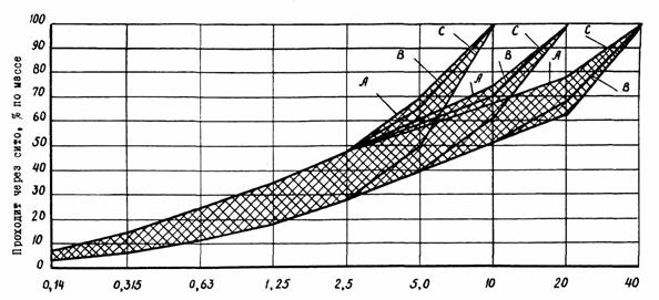 Рекомендуемый гранулометрический состав заполнителей в зависимости от подвижности бетонной смеси, обеспечивающий минимальный расход цемента приведен на рис. 2. 3.10. При использовании плотных и обработанных пористых заполнителей минимальное содержание тонкодисперсной фазы (цемент + пылевидные частицы) в бетонных смесях должно быть не менее 400 кг/м3, а расход цемента при этом не менее 300 кг/м3. В бетонных смесях на необработанных пористых заполнителях эти расходы рекомендуется увеличить на 20 - 30 кг/м3. 3.11. Для повышения однородности легкобетонной смеси, а также при недостаточном содержании в ней пылевидных частиц рекомендуется вводить тонкомолотые минеральные добавки типа зола-унос, бентонит, гидравлическая известь. Назначение и дозирование тонкомолотых добавок должно осуществляться строительными лабораториями на основании экспериментальной проверки свойств получаемых бетонной смеси и бетона. 3.12. Суперпластификаторы выбирают с учетом применяемой технологии бетонирования и особенностей возводимых конструкций. Рекомендуемые количества добавок в пересчете на сухое вещество в процентах от массы цемента при различных методах производства бетонных работ приведены в соответствующих разделах настоящих рекомендаций.