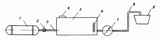 Рис. 3. Принципиальная схема установки оборудования для дозирования и подачи добавок: 1 - воздушный ресивер тормозной системы шасси базового автомобиля; 2 - пробковый кран; 3 - воздухопровод (резиновый шланг); 4 - заливная горловина с сетчатым фильтром; 5 - емкость для хранения добавок; 6 - указатель уровня; 7 - расходомер с краном управления; 8 - трубопровод; 9 - заливная горловина смесителя Таблица 6 Рекомендуемые добавки и концентрации их водных растворов для пропитки пористых заполнителей