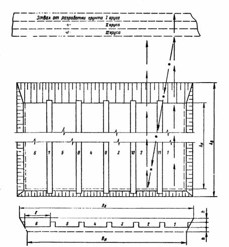 Рис. 1. Разработка второго яруса котлована бульдозером по ярусно-траншейной схеме h - высота яруса; ℓ - длина отвала бульдозера; Вн, Вв - ширина котлована соответственно но низу и по верху; Лн, Лв - длина котлована соответственно по низу и по верху; 1, 2, 3,…, 11 - последовательность разработки котлована → → - рабочий ход бульдозера; → ∙ → - холостой ход бульдозера 2.3. Разработка котлована2.3.1. До начала разработки котлована должны быть завершены следующие работы: вертикальная планировка площадки; разбивка осей котлована и его контуров с закреплением осей на обноске; устройство временных подъездных путей; планировка и подготовка площадок для отвалов грунта. 2.3.2. Разрабатывать котлован бульдозером рекомендуется по ярусно-траншейной схеме, оставляя между проходками целики грунта (рис.1). После разработки одного яруса на всю его глубину целики перемещают бульдозером в отвал и приступают к разработке следующего яруса. Количество ярусов и их глубина определяются в зависимости от параметров бульдозера. 2.3.3. Разработку неглубоких котлованов (до 1,5 м) при дальности перемещения грунта от 30 до 100 м рекомендуется производить бульдозерами. Для устройства котлованов, имеющих большую глубину, и при необходимости перемещения грунта на расстояние более 100 м следует использовать одноковшовые экскаваторы, оборудованные обратной лопатой, и самосвалы. Рекомендуемая грузоподъемность самосвалов в зависимости oт дальности перевозки грунта и емкости ковша экскаватора приведена в табл.4. Грузоподъемность самосвалов для перевозки грунта