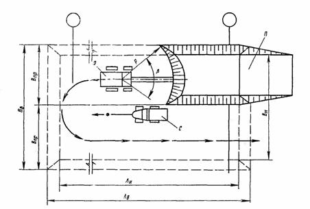 Рис. 2. Разработка котлована одноковшовым экскаватором с погрузкой грунта в автомобиль-самосвал Э - экскаватор; С - автомобиль-самосвал; R - наибольший радиус резания; β - угол поворота при догрузке в автомобиль-самосвал; Впр - ширина проходки (Впр = 1,24-1,3R ); Вн, Вв - ширина разрабатываемого котлована соответственно по низу и по верху; Лн, Лв - длина котлована соответственно по низу и по верху; П - пандусовый съезд для сваебойной машины 2.3.4. Разработку котлована одноковшовым экскаватором с погрузкой грунта в самосвалы (рис.2) выполняют продольными ходками, что позволяет предельно сократить число поворотов экскаватора и наиболее рационально организовать работу транспортных средств. 2.3.5. При погрузке грунта на транспортные средства экскаватором угол поворота его стрелы не должен превышать 70°. Соблюдение этого условия сокращает продолжительность цикла работы и повышает производительность машины. 2.3.6. При разработке котлована необходимо предусмотреть съезда в котлован для сваебойных машин, кранов и автотранспорта. Уклоны съездов должны соответствовать указанным в инструкциях по эксплуатации машин, работающих в котловане. 2.3.7. В котлованах с естественными откосами минимальное расстояние между подошвой откоса и возводимым сооружением должно составлять 0,3 м. 2.3.8. Крутизна откосов котлованов в зависимости от их глубины и свойств грунтов принимается по табл.5. Крутизна откосов котлованов глубиной более 5 м во всех случаях и менее 5 м при неблагоприятных гидрогеологических условиях, а также для грунтов, не предусмотренных табл. 5, должна устанавливаться проектом. Таблица 5 Крутизна откосов в зависимости от глубины котлована и характера грунта.