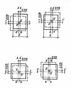 Рис. 3. Допускаемые отклонения погруженных свай в плане 1-1, 3-3 - поперечные оси ряда; А-А - продольные оси ряда; О - центр поперечного сечения сваи; О’ - зона смещения центра поперечного сечения сваи в пределах допускаемых отклонении; Д - сторона поперечного сечения сваи 3.3.26. Отклонения забитых свай (рис.3) от проектного положения в плане не должны превышать приведенных в табл.8 или указанных в проекте. 3.3.27. При погружении свай необходимо, кроме общих, соблюдать следующие правила техники безопасности. Запрещается находиться в опасной зоне. Опасными являются: зона вблизи копра с границей, проходящей по окружности, центр которой - место забивки очередной сваи, а радиус равен полной длине копровой стрелы-мачты плюс 5 м; линейная зона шириной 10 м вдоль оси троса для подтаскивания свай от места стоянки копра до места их раскладки; площадка для складирования свай, где их перемещают и раскладывают перед подтаскиванием к копру. Запрещается выдергивать сваи копровым оборудованием; погружать элементы составных свай вибропогружателями; вывозить сваебойное оборудование со стройплощадки до приемки свайного поля и оформления исполнительных актов; штабелирование сваи на дне котлована, раскладывать их на бровке и стаскивать на дно котлована, подтаскивать сваи к копру по неспланированному дну котлована. 3.3.28. Контроль качества погружения свай производится согласно нормативам, приведенным в табл.9. Таблица 9 Контроль качества погружения свай