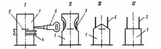 Рис. 4. Поэтапная срубка голов сваи I-установка хомута; II- вырубание бетона по углам сваи; III- срубка головы сваи; IV- подготовка сваи к установке оголовка или заделке в ростверк. 1-свая; 2-риска(отметка линии срубки головы сваи); 3-продольная арматура; 4-монтажный обжимной инвентарный хомут (на II-IV этапах монтажный обжимной хомут условно не показан); 5-отбойный молоток