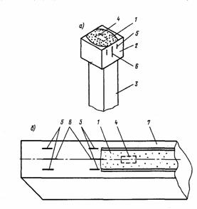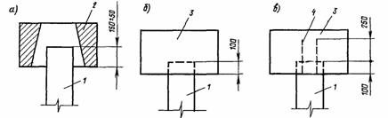 Рис. 5. Схема заделки свай а) - в оголовник; б) - в монтажный ростверк при свободном опирании; в) - то же, при жестком опирании 1 - свая; 2 - оголовок; 3 - монолитный ростверк; 4 - арматура
