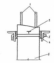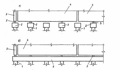 Рис. 10. Схема установки стеновых панелей а) - на оголовки; б) - на ростверки 1 - сваи; 2 - оголовки; 3 - маяки; 4 - внутренние стеновые панели; 5 - наружные стеновые панели; 6 - ростверк 4.2.5. Не допускается оставлять не заполненный раствором зазор между основанием панели и оголовком сваи или ростверком. 4.2.6. Толщина растворной постели между цокольной панелью и оголовком, или ростверком должна быть не более 30 мм. В отдельных случаях допускается увеличение толщины шва постели до 40 мм на одном оголовке сваи из трех, расположенных в одном ряду. В этом случае, а также при необходимости применения раствора марки 100 растворную постель необходимо армировать сеткой из проволоки диаметром не менее 5 мм с размером ячеек 50×50 мм или согласно указаниям проекта. 4.2.7. В зимних условиях должен применяться раствор с противоморозной добавкой. 4.2.8. Для контроля прочности раствора в швах сопряжений панелей с оголовками или ростверками из каждых 0,2 м3 раствора надлежит брать по 9 контрольных кубиков. Шесть из них выдерживают в тех же условиях, что и раствор в швах, а затем испытывают (три кубика - перед монтажом панелей и три - перед сдачей дома в эксплуатацию). Три оставшихся кубика должны храниться в нормальных условиях для определения марки раствора. Контроль качества раствора следует проводить согласно "Инструкции по приготовлению и применению строительных растворов" (СН-290-74) и ГОСТу 5802-66 "Методы испытаний строительных растворов". 4.2.9. Приведение в проектное положение и установка стеновых панелей в плане производится по рискам, нанесенным у основания панели и на опорных поверхностях элементов ростверка. Несовмещение рисок на оголовках свай и гранях монтируемых панелей не должно превышать 5 мм. 4.2.10. Установку стеновых панелей по вертикали необходимо выполнять с помощью регулируемых подкосов. Эти подкосы при помощи струбцин или специальных запорных устройств, крепят к верхнему торцу или монтажной петле стеновой панели, а нижнюю их часть - к скобе сваи, расположенной вблизи панели, или к монтажному хомуту, устанавливаемому с этой целью на сваю. В отдельных случаях можно использовать специальные якоря (бетонные блоки со скобами). Проверку вертикальности нужно производить с внутренней стороны панели вблизи ее торцов при помощи рейки-отвеса или рейки с уровнем. 4.2.11. Сразу после установки каждой панели в проектное положение ее надо окончательно закрепить. 4.2.12. При монтаже наружных цокольных панелей выравнивание их в поперечном направлении должно производиться по наружной плоскости стены. 4.2.13. В процессе работ по монтажу цокольных панелей монтируют также сантехнические и вентиляционные блоки, тепловые пункты и спецсооружения, лестничные марши, площадки и лифтовые шахты. После выполнения этих работ монтируют сантехнические и прочие трубопроводы. 4.2.14. После сдачи работ по монтажу панелей стен и прочих элементов подземной части здания разрешается приступать к монтажу панелей перекрытия цокольного этажа. 4.3. Монтаж перекрытия подземной части зданий4.3.1. До начала монтажа панелей перекрытия необходимо закончить все работы по монтажу и постоянному закреплению конструктивных элементов перекрываемой подземной части здания; установить гипсобетонные перегородки и основные столярные изделия; завершить монтаж трубопроводов и оборудования котельных; убрать монта