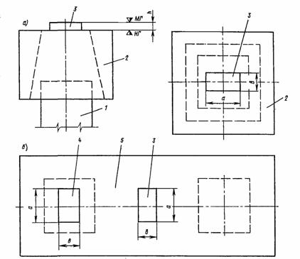 Рис. 7. Конструкции монолитных ростверков а) - с однорядным расположением свай; б) - с многорядным расположением свай 1 - пространственный каркас; 2 - опалубка; 3 - бетонная подготовка Н - высота ростверка; d - размер стороны сечения сваи; h - высота бетонной подготовки 3.6.11. Контроль качества работ по устройству монолитного ростверка приведен в табл.12. Контроль качества работ по устройству монолитного ростверка