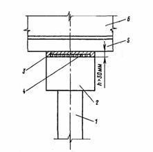 Рис. 11. Устройство шва сопряжения при величине зазора (h) более 30 мм или при применении раствора марки 100 1-свая; 2-оголовок; 3-растворная постель; 4-сетка из проволоки; 5-панель перекрытия; 6-стеновая панель. 4.3.5. Для обеспечения должного качества монтажа подземной части следует строго соблюдать порядок и очередность установки всех элементов, предусмотренный проектом производства работ. 4.3.6. Контроль качества работ по монтажу элементов подземной части здания должен производиться согласно табл.13. Таблица 13 Контроль качества монтажа конструкций подземной части здания