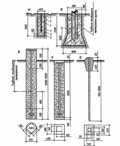 2.3.12. Машины, оборудование и инструмент применяемые при разработке котлованов, должны соответствовать принятым в проекте производства работ. 2.3.13. В зимних условиях землянке работа разрешены, если без них невозможно своевременное выполнение последующих общестроительных работ, а также, если необходимо использовать имеющееся на строительстве мощнее землеройное оборудование (емкостью ковша 1 м3 и более). Работы в зимних условиях должны выполняться по специальному проекту производства работ и обосновываться технико-экономическим расчетом. 2.3.14. Разработка мерзлого грунта одноковшовыми экскаваторами (прямая и обратная лопата) без предварительного рыхления допускается при толщине мерзлого грунта: до 0,25м для ковша емкостью 0,5-0,65 м3; от 0,25 до 0,4 и 0,8-1,25 м3. 2.3.15. Грунт, подлежащий разработке, при промерзании его на глубину более указанной в п.2.3.14. должен быть предварительно подготовлен к разработке оттаиванием или рыхлением. Утепление поверхности грунта предохраняет его от промерзания и является одним из способов подготовки грунта к разработке в зимних условиях. Способ подготовки мерзлого грунта к разработке должен выбираться и обосновываться в проекте производства работ. 2.3.16. Землеройные машины в забоях с подготовленным к разработке грунтом должна работать круглые сутки без перерывов узким фронтом во избежание промерзания грунта. 2.3.17. Разрабатывать грунт (за исключением сухого песчаного) на глубину промерзания разрешается без креплений, при дальнейшем же углублении необходимо устанавливать крепления. 2.3.18. В зимнее время грунт оснований котлованов в местах устройства фундаментов следует предохранять от промерзания путем недобора или поверхностным утеплением. Зачистку оснований надо выполнять непосредственно перед устройством фундаментов. 3. УСТРОЙСТВО СВАЙНЫХ ФУНДАМЕНТОВ3.1. Общие требования3.1.1. Устройство свайных фундаментов предусматривает выполнение следующих работ: геодезическую разбивку свайного поля; погружение свай; срубку голов свай; монтаж оголовков при устройстве безростверковых фундаментов; монтаж элементов сборных ростверков или устройство монолитных ростверков для ростверковых фундаментов. 3.1.2. Производство каких-либо работ в опасной зоне, не имеющих непосредственного отношения к выполняемому технологическому процессу, например, раскладка свай в зоне их погружение, установка монтажных хомутов или монтаж оголовков в зоне срубка голов свай и т.д. запрещается. 3.1.3. Погружение свай следует производить копровым оборудованием на базе экскаваторов или тракторов с системой наведения свай и соответствующими сменными дизельными трубчатыми или штанговыми молотами, характеристика и эксплуатационные параметры которых приведены в Приложении 3. 3.1.4. Все работы по устройству свайных фундаментов необходимо выполнять в соответствии с рабочими чертежами, проектом производства работ, а также требованиями СНиПов, "Руководства по производству и приемке работ при устройстве оснований и фундаментов" (Москва, СИ, 1977 г.), ведомственных строительных норм, руководств и рекомендаций. 3.2. Геодезическая разбивка свайного поля3.2.1. После разбивки главных и основных осей здания, окончания разработки котлована и уборки земли с бровки котлована производят детальную разбивку и закрепление всех промежуточных осей здания. 3.2.2. Д