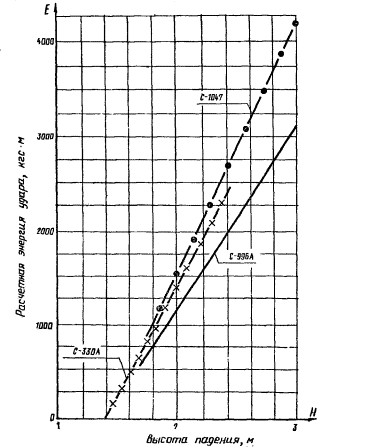 Рис. 13. Зависимость рекомендуемой расчетной энергии удара от высоты падения ударной части молота