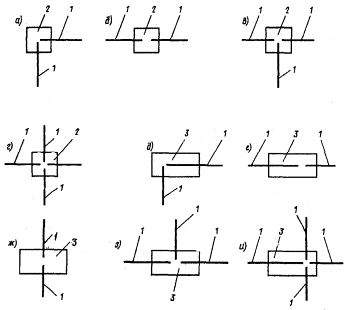 Рис. 17. Схемы расположения стеновых панелей на одинарных (а, б, в, г) и парных (д, е, ж, з, и) оголовках