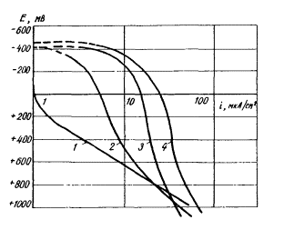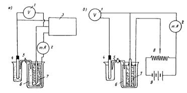 Рис. 1. Схема установки для снятия потенциостатических (α) и гальваностатических (δ) поляризационных кривых 1 - высокоомный вольтметр; 2 - миллиамперметр; 3 - потенциостат П-5327; 4 - электрод сравнения; 5 - электролитический ключ; 6 - вспомогательный электрод; 7 - образец; 8 - переменное сопротивление; 9 - источник тока 2.6. Перед снятием поляризационных кривых бетон образцов насыщают водой. Для этого необходимо выдержать образцы в воде в течение 3 сут. Образцы из бетона плотной структуры следует насытить водой в вакууме или кипячением. Затем торец образца скалывают, обнажив стержень на длине около 1 - 2 см, и место выхода стали из бетона изолируют лакокрасочным покрытием. 2.7. Подготовленный образец устанавливают в электрохимическую ячейку и определяют величину стационарного потенциала. При снятии поляризационной кривой потенциодинамическим методом с помощью потенциостата в автоматическом режиме поляризуют образец со скоростью 6 - 7,2 В/ч, измеряя величину тока через каждые 50 - 100 мВ изменения потенциала. При гальваностатическом методе измеряют стационарный потенциал в отсутствие наложенного тока, затем отдельными ступенями накладывают ток плотностью 1; 5; 10; 15; 20; 25; 30; 40; 50; 60; 80; 100; 300 и 500 мкА/см2. После наложения каждой ступени тока несколько раз с выдержкой 5 мин. измеряют потенциал. Последующую ступень тока накладывают, если в течение 5 мин. величина потенциала изменилась не более чем на 10 %. Поляризацию следует продолжать до установления потенциала +1000 мВ по насыщенному каломельному электроду для хорошо поляризующихся электродов или тока плотностью 500 мкА/см2 при слабой поляризации. 2.8. После снятия поляризационной кривой с помощью моста переменного тока следует измерить сопротивление между рабочим и вспомогательным электродами. 2.9. Результаты испытаний оформляют в виде графиков в координатах: по оси абсцисс - плотность тока в мкА/см2, по оси ординат - потенциал в мВ, При построении кривой из величины потенциала необходимо вычесть поправку на омическое сопротивление, которая получается умножением величины сопротивления на величину тока. Если электрохимическая ячейка имеет сопротивление менее 500 Ом, поправку на омическое сопротивление можно не делать. 2.10. При анализе анодной поляризационной кривой (рис. 2) обращают внимание на следующие величины: стационарный потенциал ЕСТ, потенциал пассивации ЕПАСС, потенциал пробоя пассивной пленки ЕПР, ток пассивации iПАСС, ток при потенциале +300 мВ и ток пробоя пассивной пленки iПР. При анализе результатов испытаний рекомендуется использовать следующие критерии, приведенные в табл. 1. Метод ускоренного определения эффективности ингибиторов коррозии стали в агрессивных растворах * 2.11. Метод предназначен для быстрого выбора ингибиторов коррозии стали в агрессивных растворах хлористых солей, модельных электролитах (вытяжках из бетона) и определения необходимой концентрации ингибиторов. Он позволяет в одном опыте установить критическую концентрацию СаС12 при заданной концентрации ингибиторов. * Метод разработан НИИЖБ (канд. техн. наук Н.К. Розенталь), ВЗИСИ (канд. техн. наук Н.М. Кашурников) и ИФХ АН СССР (канд. хим. наук Ю.И. Кузнецов). 2.12. По результатам испытаний строят кривые "время - ток" (хроноамперометрические кривые) при постепенно возрастающей концентрации СаС12. Стальной электрод погружают в раствор