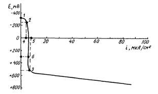 Рис. 2. Анодная поляризационная кривая стали в бетоне 1 - ЕСТ; 2 - ЕПАСС; 3 - ЕПР; 4 - iПАСС; 5 - iПР; 6 - iЕ=+300 (ток при потенциале +300 мВ)