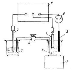 2.13. Ячейка для снятия хроноамперометрических кривых (рис. 3) состоит из рабочего электрода (1) с площадью поверхности 1 см2 изготовленного из арматурной стали класса А-II; хлорсеребряного электрода сравнения (2); вспомогательного платинового электрода (3); сосуда с исследуемым раствором электролита объёмом 100 см3 (4); сосуда с насыщенным раствором KCl (5); электролитического ключа (6), один конец которого заполнен KCl (опущен в насыщенный раствор KCl), а другой - исследуемым электролитом. Установка для снятия кривых состоит из магнитной мешалки (7), миллиамперметра (8): потенциостата П-5827 (9).