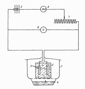 Рис 4. Схема установки для определения максимальной плотности коррозионного тока арматуры в бетоне методом измерения клеммового напряжения 1 - эксикатор; 2 - образец из бетона (раствора);3 - арматура; 4 - раствор для поддержания постоянной влажности воздуха; 5 - источник постоянного тока; 6 - микроамперметр; 7 - переменное сопротивление; 8 - высокоомный вольтметр 2.26. Для проведения испытаний изготовляют образцы-диски (рис. 5,б). 2.27. Собирают электрическую схему (рис. 5,а) с мультивибратором, схема которого приведена на рис. 6.
