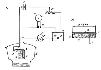 Рис. 5. Схема установки (а) и образца (б) для снятия поляризационных кривых стали в бетоне прерывистым током в условиях атмосферы различной степени влажности 1 - стальная пластинка (исследуемый электрод); 2 - бетон (раствор); 3 - перфорированная пластинка из оцинкованной стали (противоэлектрод); 4 - стеклянная трубка с агар-агаром; 5 - каломельный электрод; 6 - насыщенный раствор KCl; 7 - фарфоровый или стеклянный стакан; 8 - эксикатор; 9 - батарея; 10 - магазин сопротивлений; 11 - катодный вольтметр; 12 - электрический конденсатор; 13 - миллиамперметр; 14 - мультивибратор; 15 - изолирующая замазка (или смола) 2.28. Снимают гальваностатические поляризационные кривые (см. пп. 2.3, 2.7, 2.10). Интервалы между измерениями выбирают в соответствии со временем установки стабильного значения потенциала, соответствующего определенной плотности тока (см. прил. 4).