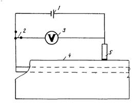 Рис. 7. Схема установки для поляризации арматуры в бетоне и измерения скорости спада потенциала 1 - источник тока; 2 - переключатель; 3 - высокоомный вольтомметр; 4 - железобетонная конструкция; 5 - медносульфатный электрод 2.31. Установку подключают к армокаркасу и устанавливают медносульфатный электрод на поверхности бетона на минимальном расстоянии от арматурного стержня. 2.32. Если на поверхности железобетонной конструкции имеется лакокрасочное покрытие, то на месте контакта медносульфатного электрода с конструкцией его следует удалить. 2.33. Определяют электрическое сопротивление цепи "медносульфатный электрод - бетон - армокаркас". Если оно не превышает 10 Ом, включают ток и в течение 1 мин поляризуют стальную арматуру анодным током. Затем ток отключают, через 0,5; 1; 2 и 3 мин измеряют величину потенциала. Если за 1 мин потенциал понизится не более чем до нуля вольт, стальная арматура в бетоне находится в пассивном состоянии; при более быстром спаде потенциала сталь активна - возможно её коррозионное поражение. 2.34. Устанавливая медносульфатный электрод в различных точках вдоль арматурного стержня и повторяя определение как указано в пп. 2.31 - 2.33, определяют состояние стальной арматуры в соответствующих точках. Кривые спада после анодной поляризации приведены на рис. 8.