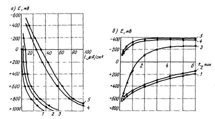 Рис. 8. Анодные поляризационные кривые стали в бетоне (а) и соответствующие им кривые спада потенциалов после анодной поляризации (б) 1 - бетон без добавки; бетон с добавкой CaCl2 в количестве: 2 - 0,3 %; 3 - 0,5 %; 4 - 1,5 %; 5 - 2 % 3. МЕТОДЫ ОЦЕНКИ КОРРОЗИОННЫХ ПОТЕРЬ СТАЛИ В БЕТОНЕ С ИНГИБИТОРАМИМетод определения потери массы металла и глубины коррозионных поражений стали в бетоне с ингибиторами * 3.1. Метод предназначен для количественной оценки эффективности воздействия ингибиторов на арматуру с помощью определения материальных потерь металла и глубины коррозионных язв. * Метод разработан МАДИ (д-р хим. наук, проф. В.В. Ратинов). 3.2. Для проведения испытаний изготовляют армированные образцы размером 7×7×7 или 4×4×16 см из цементно-песчаного раствора с соотношением вяжущего и заполнителя 1:3 и В/Ц = 0,4 - 0,5. 3.3. Арматурные стержни до укладки в формы отшлифовывают, обезжиривают и взвешивают на аналитических весах. 3.4. После набора прочности образцы подвергают испытанию в режиме периодического увлажнения и высушивания (1 сут. в воде или 3 %-ном растворе хлористого натрия и 6 сут. на воздухе). 3.5. Через определенные промежутки времени (обычно через 1, 3, 6, 12, 24 мес.) образцы разрушают, арматуру очищают от остатков бетона и продуктов коррозии с помощью ингибированной кислоты (например, 10 % HCl + 0,1 % ПВ-5 или 0,1 % катапина или другого ингибитора кислотной коррозии *), промывают, высушивают фильтровальной бумагой и после 2 - 3-часового пребывания в эксикаторе над безводным хлоридом кальция или концентрированной серной кислотой взвешивают на аналитических весах. Затем рассчитывают потерю массы на квадратный метр площади поверхности: