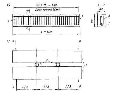 Рис. 9. Схема армирования (а) и нагружения (б) балок 1 - балка; 2 - шарнир; 3 - каркас 3.11. Для изготовления образцов должен применяться тяжелый бетон повышенной плотности (расход портландцемента 350 кг/м3, В/Ц = 0,55). Материалы для приготовления бетона должны удовлетворять следующим требованиям: цемент - портландцемент (ГОСТ 10176-76) марок 400 - 500 с содержанием C3S - 55 %, С3А - 4 - 6 %, нормальная густота ≤ 27 - 28 %; возможно применение цементов с другим минералогическим составом, что должно быть специально обосновано; для всех цементов должно быть известно количество щелочей (К2О + Na2О); песок - кварцевый, МКР ≥ 2,2, содержание пылевидных и глинистых примесей не более 1 %; щебень - гранитный или известняковый фракции 5 - 10 мм, количество пылевидных и глинистых примесей не более 0,5 %; вода - питьевая. 3.12. Добавки вводят в бетон вышеуказанного состава, который является эталонным, дозировку добавок указывают в процентах от массы цемента. В случаях, когда добавки пластифицируют бетонную смесь, уменьшают содержание цемента и воды для сохранения подвижности (жесткости) бетонных смесей. 3.13. Твердение бетонов осуществляется в камере нормального хранения в соответствии с ГОСТ 10180-74 и при гидротермальной обработке по мягкому режиму (2 + 3 + 6 + 2 ч), температура изотермического прогрева должна составлять 80 - 85°С. 3.14. Через 28 сут. определяют прочность бетона при сжатии (образцы с ребром 100 мм) в соответствии с ГОСТ 10180-74 и нагружают балочки до раскрытия трещин, после чего их устанавливают на коррозионные испытания. 3.15. Для образования трещин балочки попарно нагружают при помощи специальных устройств (рис. 9, б). Ширину раскрытия трещин определяют на боковой поверхности железобетонных образцов по оси рабочей арматуры с точностью до ±10 мкм. Ширина раскрытия трещин в эталонных образцах и в образцах с добавками ингибиторов должна составлять ряд (примерно): 0,1; 0,2; 0,3; 0,4; 0,5 мм. 3.16. Попарно нагруженные образцы с фиксированными трещинами (.эталоны и с ингибиторами) устанавливают на коррозионные испытания, условия которых определяют в зависимости от параметров эксплуатационной среды. Обязательными для сопоставительной оценки являются испытания в комнатных условиях (температура 18 - 23°С) при периодическом увлажнении 2 раза в сутки 0,1 н раствором NaCl (1 ч в растворе и 11 ч сушка). Продолжительность испытаний принимается равной 0,5; 1; 2 и 4 года. Результаты, полученные в первые два срока, используют для предварительных выводов. 3.17. Величину коррозии арматуры в соответствующие сроки оценивают после вскрытия не менее шести образцов-близнецов из бетона эталонного состава и с ингибиторами (для каждой ширины раскрытия трещин и концентрации ингибитора). При этом определяют: площадь коррозионного поражения арматуры (см2) или длину по образующей участка арматуры с коррозией, см; величину коррозионных потерь, г; максимальную и среднюю глубину язв, мкм; уменьшение деформативности и разрывного усилия, %; глубину нейтрализации (карбонизации) бетона, мм; содержание в бетоне ингибитора и активатора коррозии. Площадь поражения определяют с точностью до 1 мм2 при помощи трафарета на развертке поверхности участка арматуры; допускается оценивать площадь коррозии как произведение длины пораженного участка арматуры на периметр. 3.18. Величину коррозионных потерь определяют гравиметрическим способом. Для этого арматур