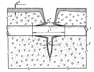 Рис. 10. Схема раскрытия трещины в железобетонном элементе и нейтрализации бетона 1 - арматура; 2 - бетон; hб - глубина нейтрализации бетона с поверхности;
