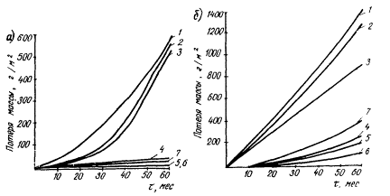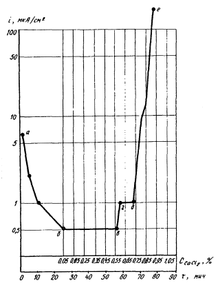 Из кинетических кривых "коррозия - время" (см. рис. 15, а)следует, что при концентрации ННК 1 % коррозия примерно равна коррозии в контрольных образцах, не содержащих добавок. И только при очень малой дозировке ННК (0,02 - 0,2 %) защитное действие ННК снижается и коррозионные потери металла приближается к потерям в образцах, содержащих только хлорид кальция без ингибитора. При усилении агрессивности среды (см. рис. 15, б) при концентрации ингибитора выше 1 % проявляются его защитные свойства; в этих условиях коррозия меньше, чем в контрольных образцах без добавок. Одновременно с уменьшением потерь массы значительно сокращается площадь коррозионного поражения.