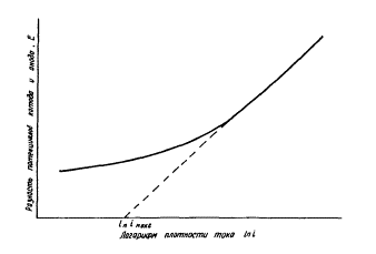 При построении указанной зависимости в полулогарифмических координатах, функция Vк - Vа = f(ln i) имеет линейный характер в области коррозионных токов, а экстраполяция прямолинейного участка на ось абсцисс дает величину максимальной плотности коррозионного тока (рис. 13).