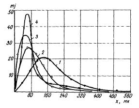 1 - без ННК; 2, 3, 4 - соответственно 0,02; 0,2; 1 % ННК; mj - количество коррозионных язв, х - их глубина