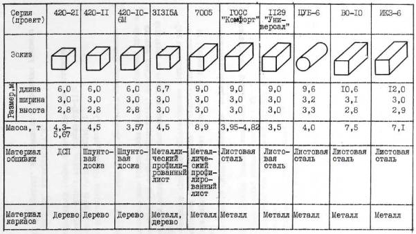 Рис. 1. Конструктивные решения зданий рамно-панельные (основные элементы - панели стен, плиты перекрытия и плоские или пространственные рамы; серия 420-12 и др.); блок-контейнерные (основной элемент - блок-контейнер; серии 420-21, ИКЗ-6 и др.), 1.6. Здания могут иметь размеры в плане от 3,4×2,2 м (блок-контейнер О3НО Латавтодормост) до 24×200 м и более. 1.7. К элементам зданий относятся: блок-контейнеры; панели стен и перегородок; плиты перекрытия и покрытия; рамы плоские и пространственные; горизонтальные линейные элементы (прогоны, ригели, подкрановые балки и др.); вертикальные линейные элементы (стойки, колонны); элементы фундаментов (блоки, подушки, сваи и др.); доборные элементы; фермы и панели фриза для образования скатной кровли; прочие (ветровые связи, ворота, стяжки и др.). Основные конструктивные решения элементов зданий представлены на рис. 2, 3. 1.8. Каркас элементов бывает деревянным, деревометаллическим или металлическим. Деревянный или деревометаллические каркасы, как правило, не рассчитаны на восприятие усилия распора, и поэтому для монтажа и демонтажа таких элементов требуются грузозахватные средства с вертикальными стропами. Обшивка элементов выполняется в основном из досок и стального листа (профилированного или непрофилированного). Материал обшивки не рассчитан на механические воздействия (обжатие стропами, удары и пр.). 1.9. Для заполнения стыков между элементами зданий применяются: герметизирующие мастики (серия "Вахта"); уплотняющие материалы (серия "Модуль"); теплоизоляционные маты и пакля (серия 420-11); герметизирующие ленты (серия 223K-TЗ-78, склад площадью 288 м2); нащельники, накладки, плинтуса и т.п. 1.10. Кровля, как правило, выполняются в заводских условиях при изготовлении элементов зданий, но в ряде серий применяется рулонная кровля, выполняемая на строительной площадке (серия УСРЗ).