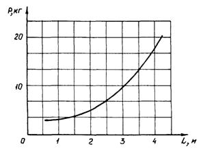 п - количество случаев использования грузозахватных средств для монтажа и демонтажа элементов зданий за год. 4.8. В приложении 5 приведен пример определения сравнительного экономического эффекта вариантов строповки блок-контейнеров траверсами с вертикальными ветвями и четырехветвевыми стропами. В приложении 6 приведен пример определения сравнительного экономического эффекта вариантов применения грузозахватных средств для строповки блок-контейнеров с устройствами для строповки, расположенными в верхнем и нижнем поясах. 4.9. Технико-экономическое сравнение вариантов применения при монтаже и демонтаже зданий других видов технологической оснастки выполняется по формуле (1). 4.10. На рис. 7, 8, 9 показаны построенные по данным практического проектирования технологической оснастки графики зависимостей масс подкосов, струбцин и средств подмащивания от их линейных размеров. Приведенные графики характеризуют предельно допустимые значения показателей материалоемкости (массы) технологической оснастки, и предназначены для использования при ее выборе и проектировании.