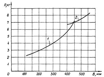 Рис. 8. Зависимость максимально допустимой массы Р струбцин от толщины В закрепляемых элементов 1 - струбцины, устанавливаемые вручную; 2 - то же, механизированным способом