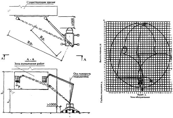 Расстояние между стрелой крана-манипулятора, коленами подъемника в любых их положениях и выступающими частями здания должно быть не менее 0,5 м.