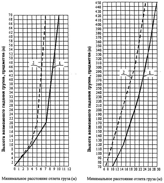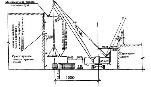 4.9. При выборе крана с подъемной стрелой необходимо, чтобы от габарита стрелы до выступающих частей здания соблюдалось расстояние не менее 0,5 м, а до перекрытия (покрытия) здания и других площадок, на которых могут находиться люди, не менее 2 м по вертикали, как показано на рисунках 1 и 2. При наличии у стрелы крана предохранительного каната указанные расстояния принимаются от каната согласно рисунку 10.