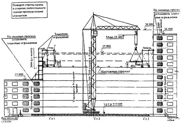 4.17. Монтаж конструкций верхних этажей многоэтажных зданий краном на "себя", когда расстояние между стрелой и перекрытием (покрытием) или предохранительными канатами и перекрытием (покрытием) менее 0,5 м, или когда подъемная стрела "режет" здание, то есть пересекается с контуром строящегося здания, осуществляется по специально разработанной технологии с учетом мероприятий по безопасному производству работ с ограничением количества рабочих, находящихся на монтажном горизонте, и выхода их на монтажный горизонт.