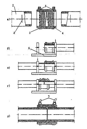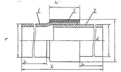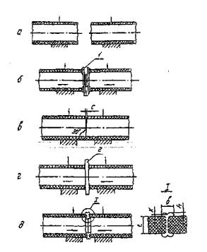 Рисунок 1 Последовательность процесса сборки и сварки встык труб из полиэтилена. а - центровка и закрепление в зажимах сварочного аппарата концов свариваемых труб; б - механическая обработка торцов труб с помощью торцовки 1; в - проверка соосности и точности совпадения торцов по величине зазора «С»; г - оплавление и нагрев свариваемых поверхностей нагретым инструментом 2; д - осадка стыка до образования сварного соединения (К, b и h - буквенные обозначения размеров шва в сечении 1) 7.3.3 Технологический процесс соединения труб с помощью деталей с ЗН включает в себя (рисунок 2): - подготовку концов труб (очистка от загрязнений, механическая обработка - циклевка свариваемых поверхностей или снятие защитной оболочки, разметка и обезжиривание); - сборку стыка (установка и закрепление концов свариваемых труб в зажимах центрирующего приспособления с одновременной посадкой детали с ЗН, подключения детали с ЗН к сварочному аппарату); - сварку (задание программы процесса сварки, пуск процесса сварки, нагрев, охлаждение соединения). 7.3.4 Соединения полиэтиленовых труб со стальными трубами (или арматурой) выполняют разъемными или неразъемными. 7.3.5 При выполнении сварочных работ организация должна иметь сварщиков и специалистов сварочного производства, аттестованных по правилам [11], а также [10], аттестованное согласно [12] сварочное оборудование, технологический режим сварки, аттестованный в соответствии [13], и аттестованную лабораторию контроля качества сварочно-монтажных работ. 7.3.6 Трубные вставки вваривают при помощи муфт с ЗН в газопроводы диаметром от 20 до 400 мм или сваркой встык нагретым инструментом в газопроводы диаметром от 63 мм и более. 7.3.7 Освобождение газопровода от грунтовой присыпки производят на длине, определяемой суммой длин ввариваемой вставки и освобождения концов газопровода согласно [6]. При вварке вставки с помощью муфт с ЗН ее длину выбирают, равной длине рассечки газопровода, но не менее 500 мм.
