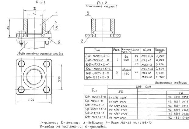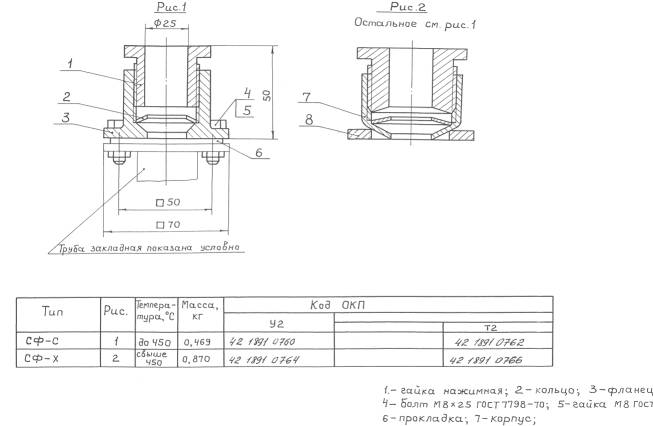 Настоящие технические условия распространяются на оправы закладные, состоящие из трубы закладной и сальника с фланцем или из трубы закладной и бобышки с фланцем. Оправы закладные предназначены для установки преобразователей термоэлектрических по ГОСТ 6616-74 в кирпичной кладке печей и аппаратах с внутренней кирпичной кладкой. Материал трубы выбирается в зависимости от измеряемой температуры: при температуре до 450 °С - сталь углеродистая обыкновенного качества по ГОСТ 380-71, при температуре свыше 450 °С - 12×18H10Т ГОСТ 9941-81. Сальник с фланцем и бобышка с фланцем изготавливаются методом литья под давлением из алюминиевого сплава для применения при температуре до 450 °С, а при температуре свыше 450 °С - из стали А20 ГОСТ 1414-75. Фланец, привариваемый к трубе, сальнику и бобышке, предназначенным для работы при температуре свыше 450 °С, изготавливается из стали В Ст3 кп2 ГОСТ 380-71. Для трубы, применяемой при температуре до 450 °С, используется этот же фланец. Настоящие технические условия устанавливают требования к оправам закладным, изготовляемым для нужд народного хозяйства и для поставки на экспорт. Климатическое исполнение оправ закладных У и Т категории 2 по ГОСТ 15150-69. Пример записи при заказе: трубы закладной длиной 197 мм для температуры до 450 °С - "Труба закладная 197-C У2 ТУ36.1138-83"; "Труба закладная 197-C Т2 ТУ36. 1138-83"; трубы закладной длиной 197 мм для температуры свыше 450 С - "Труба закладная 197-Х У2 ТУ36. 1138-83"; "Труба закладная 197-Х Т2 ТУ36. 1138-83"; сальник с фланцем для температуры до 450 С - "Сальник с фланцем СФ-С У2 ТУ36. 1138-83"; "Сальник с фланцем СФ-С Т2 ТУ36. 1138-83"; (Измененная редакция, Изм. № 2). сальник с фланцем для температуры свыше 450°С - для умеренного климата - "Сальник с фланцем СФ-Х У2 ТУ36. 1138-83"; для тропического климата - "Сальник с фланцем СФ-Х 12 ТУ36. 1138-83"; бобышка с фланцем для температуры до 450 °С с резьбой М20×1,5 - для умеренного климата - "Бобышка с фланцем БФ-М20×1,5-С У2 ТУ36. 1138-83"; для тропического климата - "Бобышка с фланцем БФ-М20×1,5-С Т2 ТУ36. 1138-83"; бобышка с фланцем для температуры свыше 450 °С с резьбой М20×1,5 - "Бобышка с фланцем БФ-М20×1,5-Х У2 ТУ36. 1138-83"; для тропического климата - "Бобышка с фланцем БФ-М20×1,5-Х Т2 ТУ36. 1138-83". Перечень документов, использованных в настоящих технических условиях, приведен в приложении 4. Оправы закладные должны соответствовать условиям, предусмотренным заказ-нарядом, и "Условиям поставки товаров для экспорта", утвержденным постановлением Совета Министров СССР от 17 сентября 1980 года № 804. (Измененная редакция, Изм. № 2). Содержание 1. ТЕХНИЧЕСКИЕ ТРЕБОВАНИЯ1.1. Общие требования 1.1.1. Оправы закладные должны соответствовать требованиям настоящих технических условий и комплекта документации: X26.240.015, Х26.434.035, X26.452.019. 1.2. Основные параметры и размеры 1.2.1. Код ОКП, основные размеры и масса оправ закладных приведены в приложениях 1, 2, 3 настоящих технических условий. 1.2.2. Неуказанные предельные размеры обрабатываемых поверхностей должны соответствовать по H14, h14 остальных пo Js 14 ГОСТ 25346-82, ГОСТ 25347-82. 1.2.3. Резьба на деталях должна соответствовать требованиям конструкторской документации и ГОСТ 24705-81. Поле допуска по ГОСТ 16093-81. 1.3. Характеристики 1.3.1. Размеры оправ не должны выходить за пределы, установленные пунктами 1.2.1., 1.2.2. настоящих технических условий. 1.3.2. Средний срок службы оправ закладных - 6 лет. 1.3.3. Поверхности деталей должны быть чистыми и не должны иметь забо