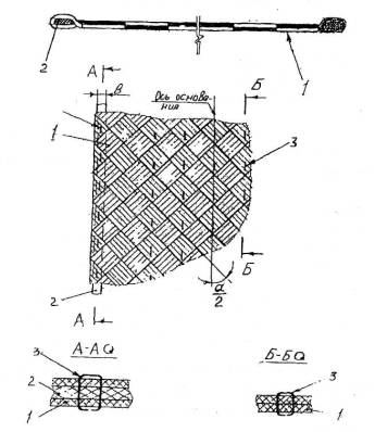 Настоящие технические условия распространяются на дорожное армирующее полотно, предназначенное для применения в качестве армирующего материала, укладываемого в основании насыпи при строительстве дорог в условиях обводненной и заболоченной местности. Армопрослойка представляет собой сплошное полотно, полученное путем сплетения между собой отдельных полос сетчатого синтетического материала, уложенного сплошным переплетением в один слой под углом 90° друг к другу и под углом 45° к оси основания, в виде полотен определённой длины заводского изготовления, полностью готовых к применению, соединяемых на месте применения сшивкой внахлёст, при этом в перегибы полос у кромок основания вплетены канты из эластомерного армированного материала в виде полосок или жгутов, причём полосы между собой и кантами в некоторых заранее определённых местах сшиты. Все требования настоящих технических условий являются обязательными. Полотно обозначают в соответствии с нижеприведенной схемой.